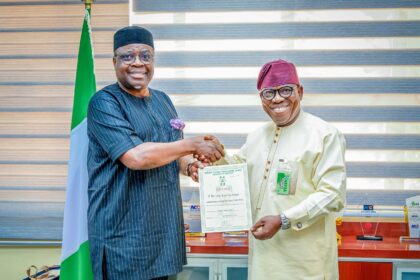 Dr. Olufemi Ogunyemi MD/CEO NEPZA (left), presenting the Operation Licence to Mr.…