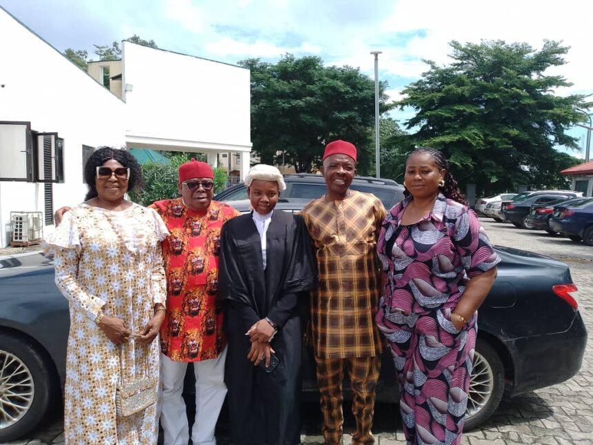 L – R: Mrs Ubani, the mother of the newly called -to-bar, Barr Mmesoma Blossom Ubani, Chief Mike Nwoko, the newly called to the bar, Barr Blossom Mmesoma Ubani, herself, Chief Ifeanyi Ubani, the father of the newly called to bar, and one other personality at the reception, organized for the newly called to bar at NUJ, FCT chapter, Utako, FCT shortly after the call to the bar in Abuja